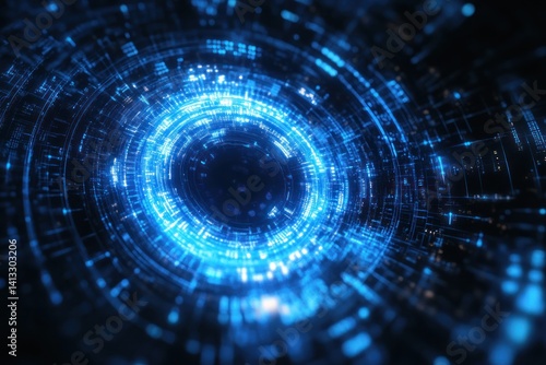 Abstract digital tunnel with blue light and geometric shapes in dark background.