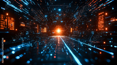 Abstract digital tunnel with glowing blue and orange lines and particles in dark background.
