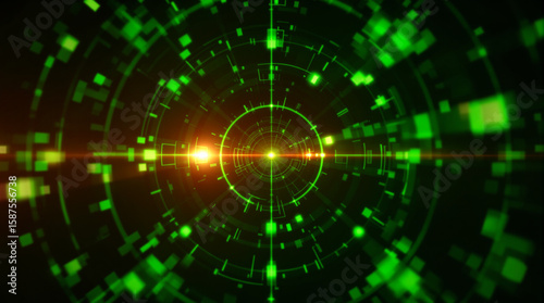 Abstract digital tunnel with glowing green squares and orange center, radiating outward in concentric circles against a black background, creating a futuristic, technological effect