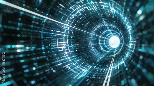 Abstract digital tunnel with glowing lines and data streams.