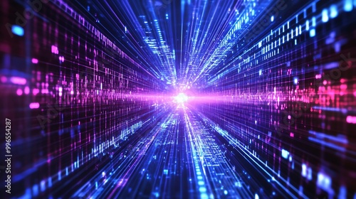 Abstract digital tunnel with glowing lines, blue and purple colors.