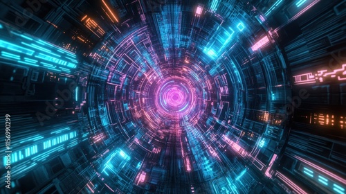 Abstract digital tunnel with glowing neon lights and intricate circuitry.