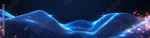 Abstract digital wave formed by glowing blue hexagonal grid lines with orange particle accents on a dark background, evoking a sense of advanced technology and data flow