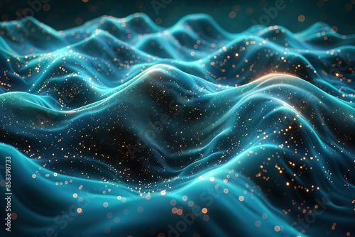 Abstract digital wave landscape with glowing particles, showcasing a futuristic or scientific rendering of data visualization or energy waves.