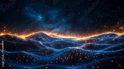 Abstract digital waves of blue and orange light dancing in a cosmic landscape.