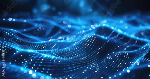 Abstract digital waves with glowing dots in blue tones, representing data flow and technology.