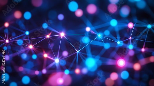 Abstract economic visualization as a glowing circuit board, fluorescent lines forming intricate connections, radiant nodes symbolizing data points, neon hues of blue and purple,