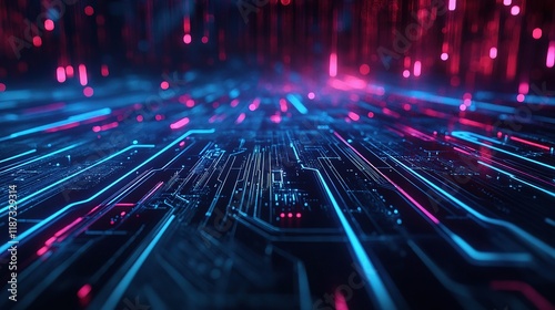 Abstract Electronic Circuit Board Design with Blue and Red Lines