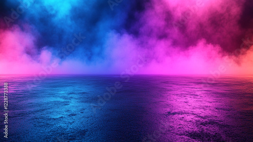Abstract empty background with dark asphalt and neon purple, blue and pink light spots for car presentation minimalistic bright tone modern blurred empty blank caption space on the side