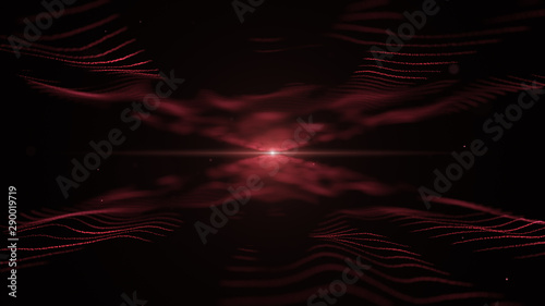 Abstract energy background. Imitation of red waves on black backdrop. Light blurred red blick is on the centre, and between the waves.