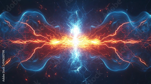 Abstract energy clash; red and blue plasma collide, creating bright light in the center.