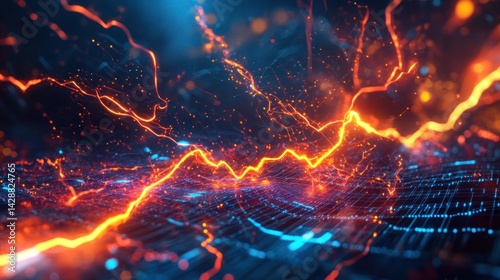 Abstract energy flow, digital landscape, glowing particles, network background, tech design