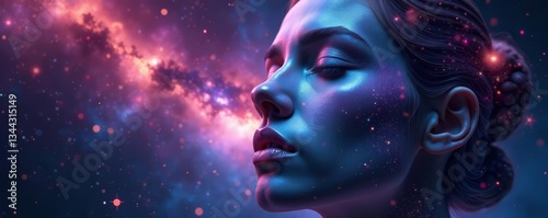 Abstract face superimposed on galaxy backdrop, portrait, surreal, space