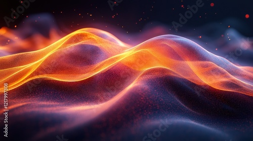 Abstract fiery landscape, digital art, glowing particles, vibrant colors, dynamic waves, mesmerizing texture, fiery hills, cosmic dust, energy flow, abstract background