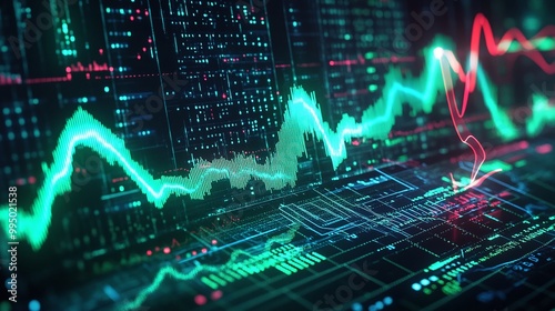 Abstract financial data visualization with colorful graphs and charts on digital screens.