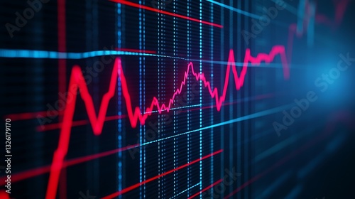 Abstract Financial Data Visualization with Red and Blue Lines on Dark Background Representing Market Trends