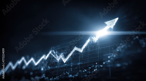 Abstract financial data visualization with upward trend line and glowing arrow in digital style on dark background
