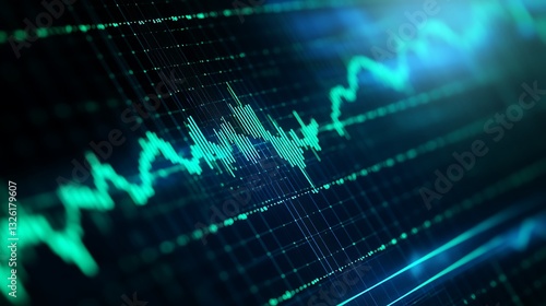 Abstract Financial Graph with Fluctuating Lines and Digital Data Representation in Green and Blue Tones