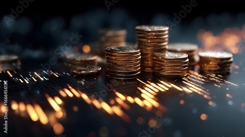 Abstract fintech background with glowing coins and graphs