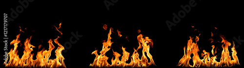 Abstract flames collection isolated on black background. Burning effect. Flames in the night sky.