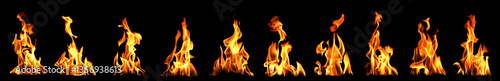 Abstract flames collection isolated on black background. Flames on black background. Concept of burning effect texture. Graphic design. Bonfire. Flames at night. Flame effect with burning fire.