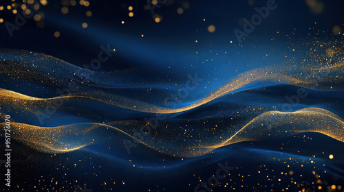 Abstract flowing waves of golden particles on a deep blue background, creating a dynamic and elegant visual with a luxurious feel