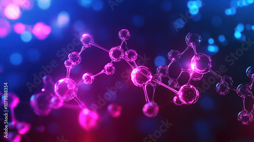 Abstract futuristic background with a glowing 3D model of a molecular structure in shades of dark blue and pink