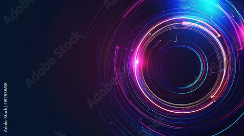 Abstract futuristic background with colorful light lines in circular motion on dark blue background, illustration