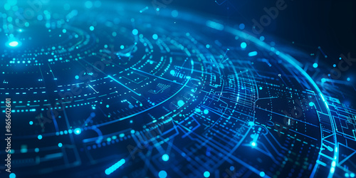 Abstract futuristic background with glowing circles and digital elements on a blue background.