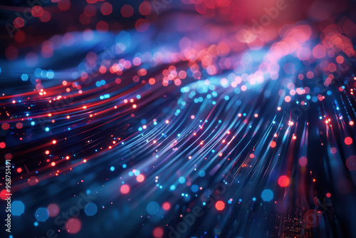 Abstract futuristic background with glowing white and blue light effect on the circuit board, fiber optic cables in motion blur. Digital technology concept.