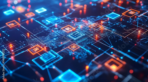 Abstract Futuristic Circuit Board with Glowing Blue and Orange Connections