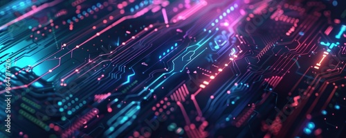 Abstract futuristic circuit board with glowing neon lights. 3D rendering concept of digital technology, artificial intelligence, and innovation