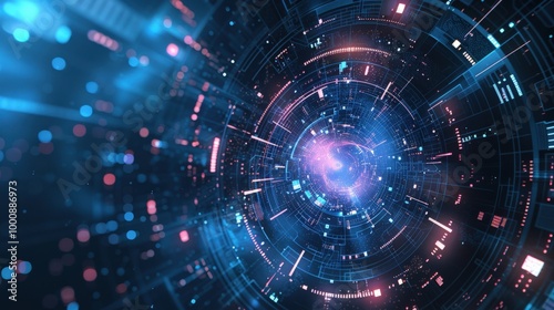 Abstract futuristic data vortex with glowing neon lights, representing digital connectivity, information flow, and advanced technology in cyber world. Blue pink colors create dynamic visual effect.