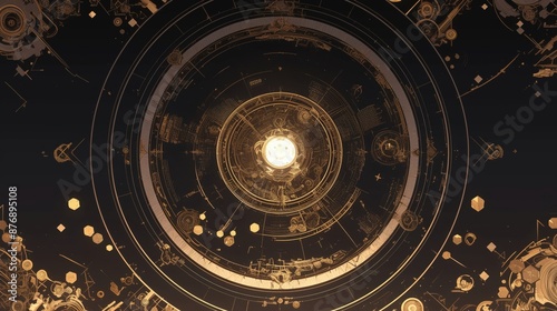 Abstract Futuristic Digital Art with Intricate Geometric Patterns and Golden Accents on a Dark Background