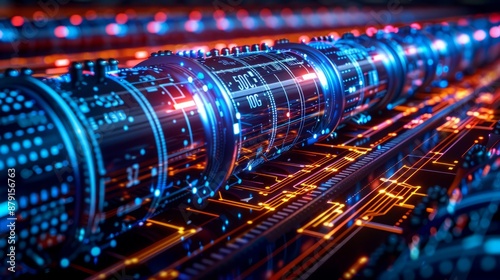 Abstract futuristic digital data stream flowing through a glowing server rack.