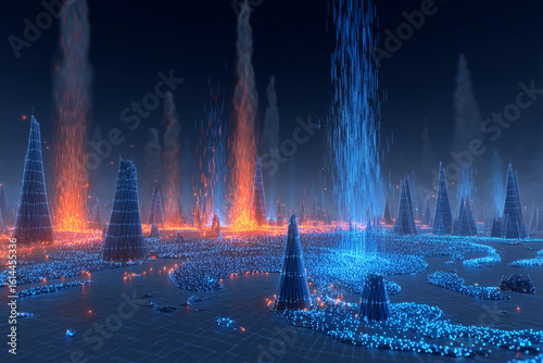 Abstract futuristic landscape with glowing geometric structures and energy streams