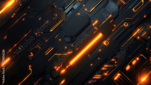 Abstract Futuristic Network of Glowing Orange Lines and Dark Metallic Shapes