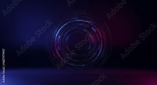 Abstract Futuristic Technology Background with Glowing Blue and Purple Neon Circle and Data Flow Lines