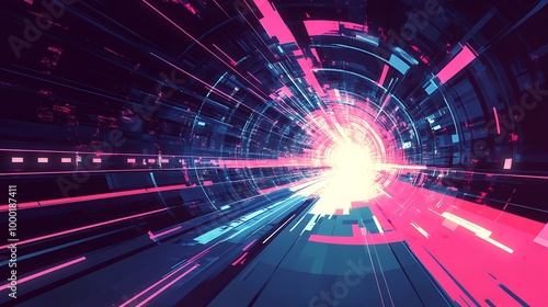 Abstract futuristic tunnel with neon lights and glowing white light at the end.