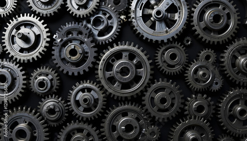 Abstract Gears Background,A close-up, top-down view of numerous interlocking gears of various sizes and designs. The gears are metallic