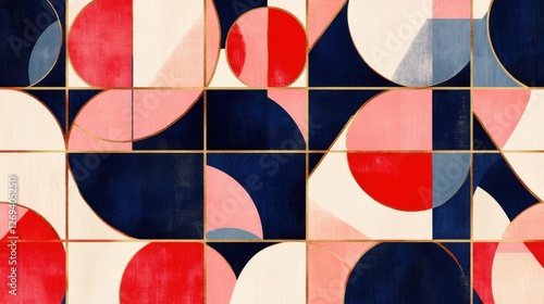 Abstract Geometric Art Featuring Red and Blue Triangles, Circles, and Pink Accents, Elegant Design for Modern Spaces