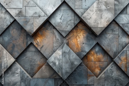 Abstract geometric background of metallic triangles with varied oxidation, creating a mosaic of rust and metal