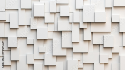 Abstract geometric background with a grid of three-dimensional white rectangular blocks of various sizes, creating a modern and minimalistic pattern.