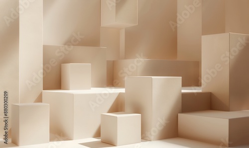 Abstract geometric background with cubes and boxes in light beige tones. Background for product presentation, mockup template. Abstract minimal concept. Wide angle lens with natural lighting.