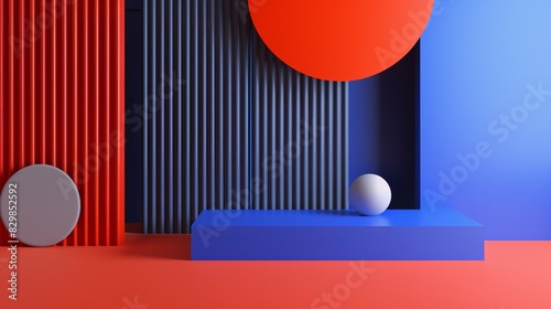 Abstract geometric composition with red, blue, and gray shapes. Features vertical lines, circles, and rectangular blocks