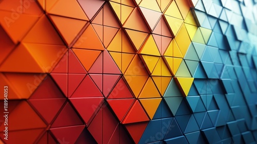 Abstract geometric pattern of colorful triangular shapes in a 3D arrangement.