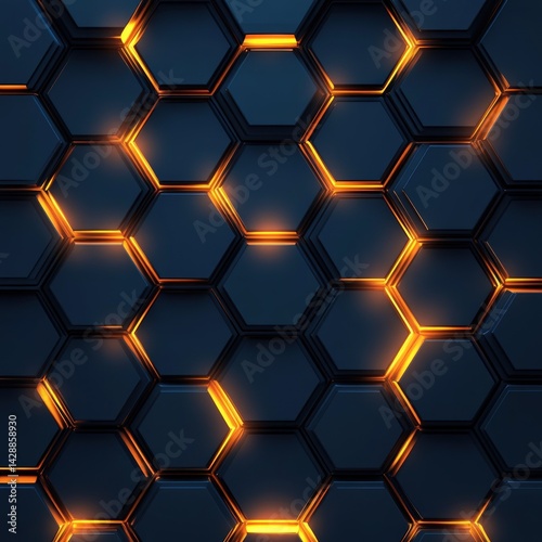 Abstract geometric pattern of dark hexagons with glowing orange highlights