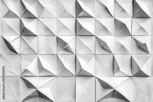 Abstract geometric pattern of folded paper triangles. A grid of interlocking, three-dimensional, white triangles creates a textured, repeating surface design