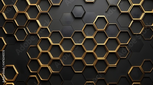 Abstract geometric pattern of overlapping hexagons in dark gold and black.