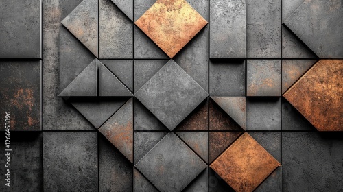 Abstract geometric pattern of textured metal and stone tiles with copper accents